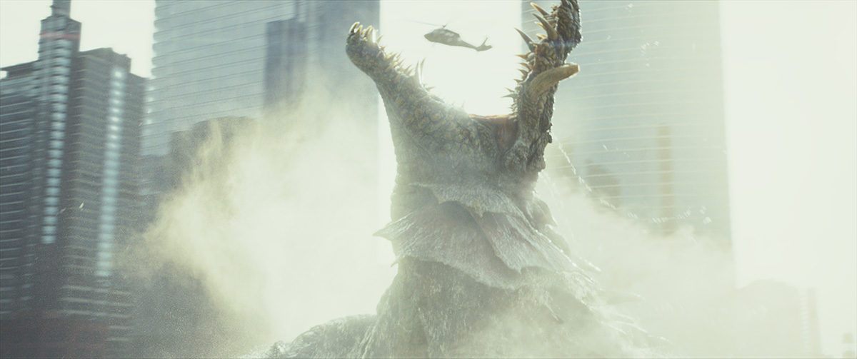 An interior view of the tower under attack was filmed on a sound stage in Atlanta with desks and office furniture. Behind that sees a CG Lizzie tear through. “The interior shots were actually pretty tricky,” notes Unterfranz. “It was a lot of destruction, and that smaller scale stuff like ceiling tiles, chairs, and pot plants, paper, and sparks – I always find the difficult stuff to really make sure you’ve got right is the stuff we see every day.