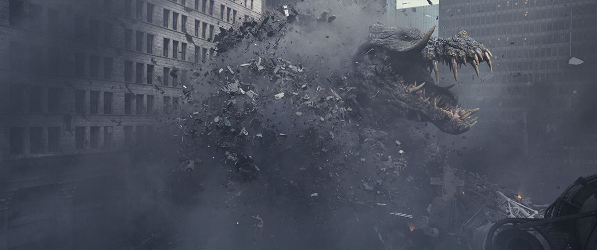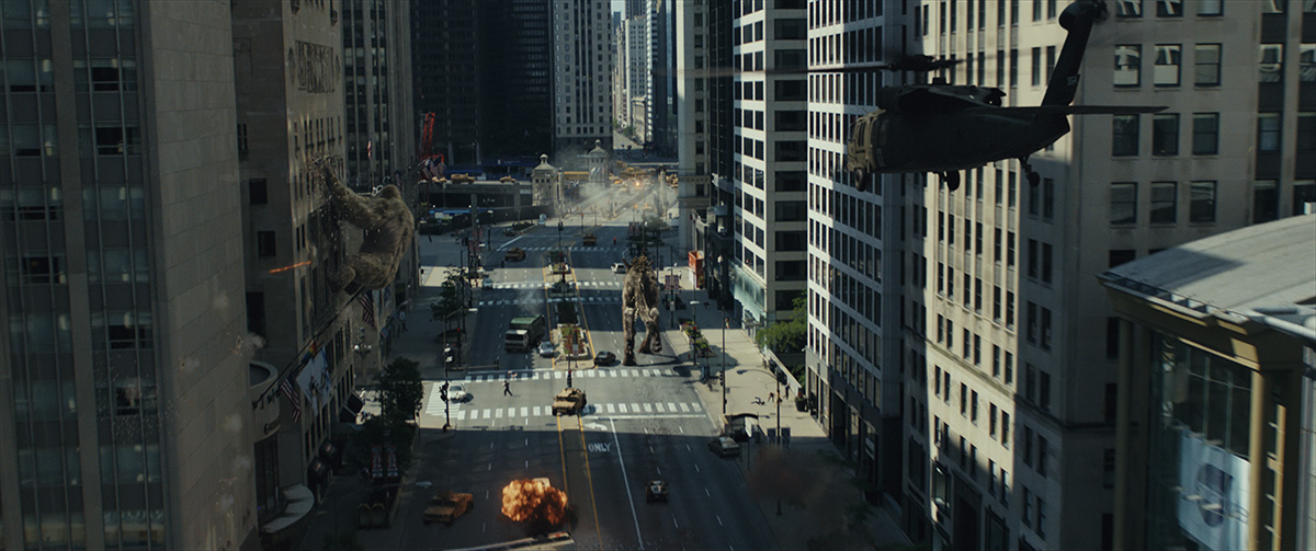 Shooting the Chicago scenes then involved actual plates filmed in the city, and on a backlot and sound stages in Atlanta. Various ‘islands’ of debris were created, which Weta Digital would use as a base and then expand upon. Knowing they would need to frame for giant monsters, the production used “crazy telescopic poles with orange tennis balls on them,” says Unterfranz, “as well as simply counting the stories of buildings to work out the correct heights.”