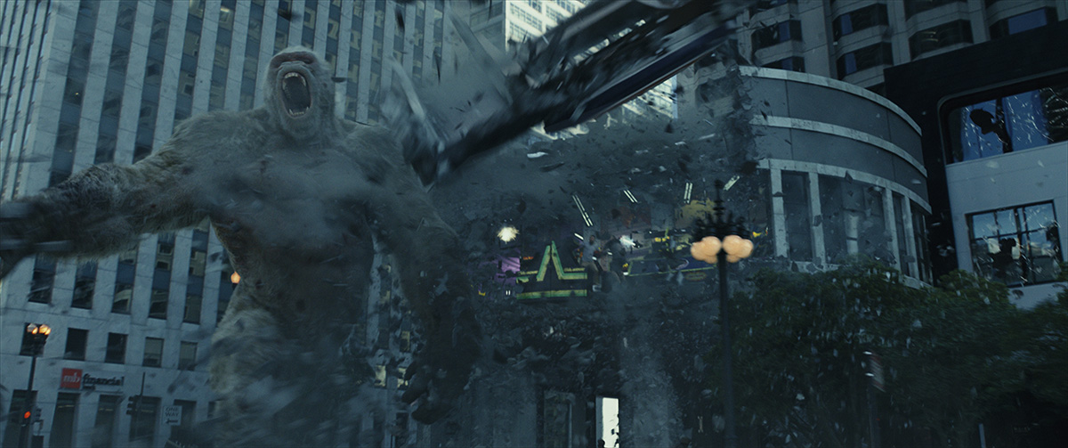 For Weta Digital, Rampage was certainly a film that catered to the studio’s strengths: photoreal beasts and heavy destruction. But Winquist says the usual experience of doing that on a film was elevated – in an extremely positive way – by the outlandishness of the story. “The thing that was clear from the onset was that it was a movie that knew what it was,” the visual effects supervisor says. “It doesn’t take itself too seriously. I mean, my eyebrow went up a little bit like, ‘They’re making a movie of this video game?’ But the screenwriters came up with something pretty interesting. And then you throw Dwayne Johnson into the mix, who has a very particular kind of character that he plays and a very particular kind of movie that he’s in. It was a blast.”