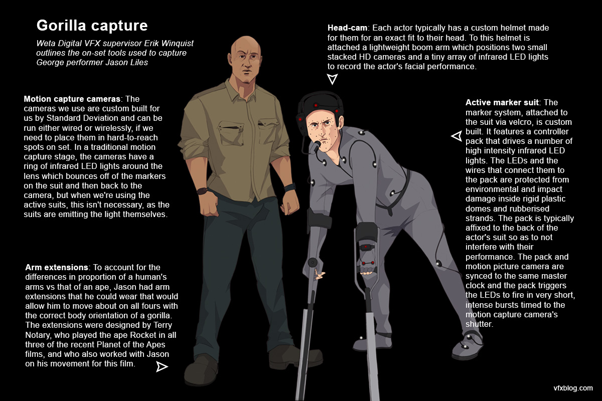 “For instance,” continues Martin, “there’s a really great shot of George scaling a building using two hands and a jumping up motion. We used chimp reference of when they’re swinging from vine to vine through the trees – we’ve actually got a reasonably extensive library of motion from previous movies – and we’re still re-using Terry Notary’s performances from the Apes films.”