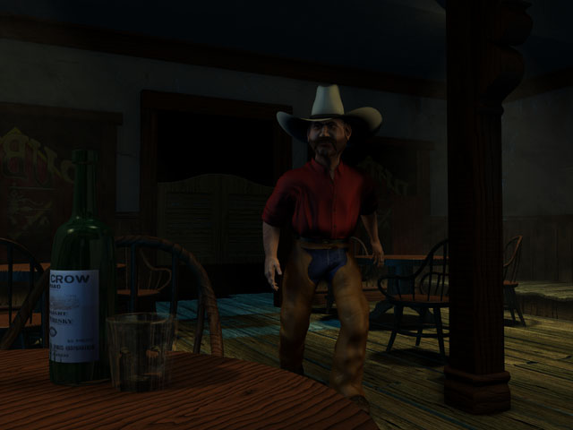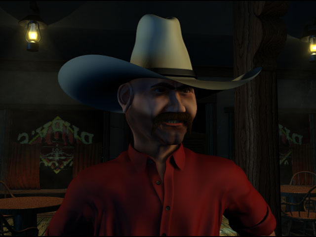 Kevin Lombardi: And so I sat down with the guys and we started to storyboard something, and it all started with, what if a cowboy walks into a bar? And seriously, that’s kind of how it began. Those guys always tease me because I was a big country western music fan, and I was kind of into country music. One of my exercises to test the modelling was that I built a little cowboy. A little fat, tubby, blonde haired, big moustached little cowboy, and he didn’t have a name, and of course we didn’t render him because it was just hardware rendering that we were using at the time.