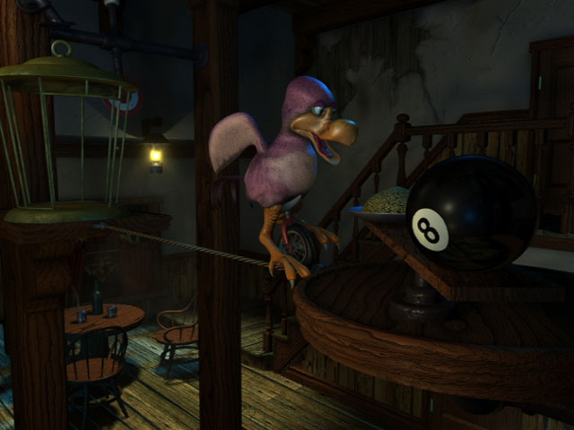 Kevin Lombardi: Unforgiven was my favourite movie at the time, if you know that western movie with Clint Eastwood, and so that’s where I got the idea to model the inside of the bar/whorehouse. And so I always wanted to animate the cowboy to look sort of like Yosemite Sam, that really exaggerated, snappy animation that uses deformations and breaking lines and profiles. And the guys were against it, because they wanted to do something a little bit more traditional, but anyway, we all sort of pitched in and did our own thing. Jason animated a walk cycle, I animated the guy kicking the door down, Corban animated the dodo bird, and we sort of all just took ownership of different parts of the sequence and then put it all together.