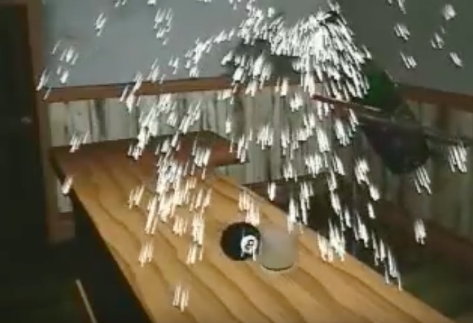 Adrian Graham: I tried to do everything as accurately as possible for the film. So, for the bullet shot, for example, I actually fired a rigid body bullet at the weighted object, the hand – I didn’t animate that back and forth – I think it’s actually in our rigid body simulation. Because that bullet is travelling so fast, it passed through the surface from one frame to the next. So, you had to really tweak all the sub-frame samples to catch the time. But when you do that, it messes with the animation so you have to offset everything. It’s just kind of the same limitations and challenges that you have today. It’s surprising how little has changed. But, again, as the rocket takes off here, to get a smooth trail of particles, I think I did that with sprites. You have to crank up the over samples to get it to not be chunky, which is really lame.