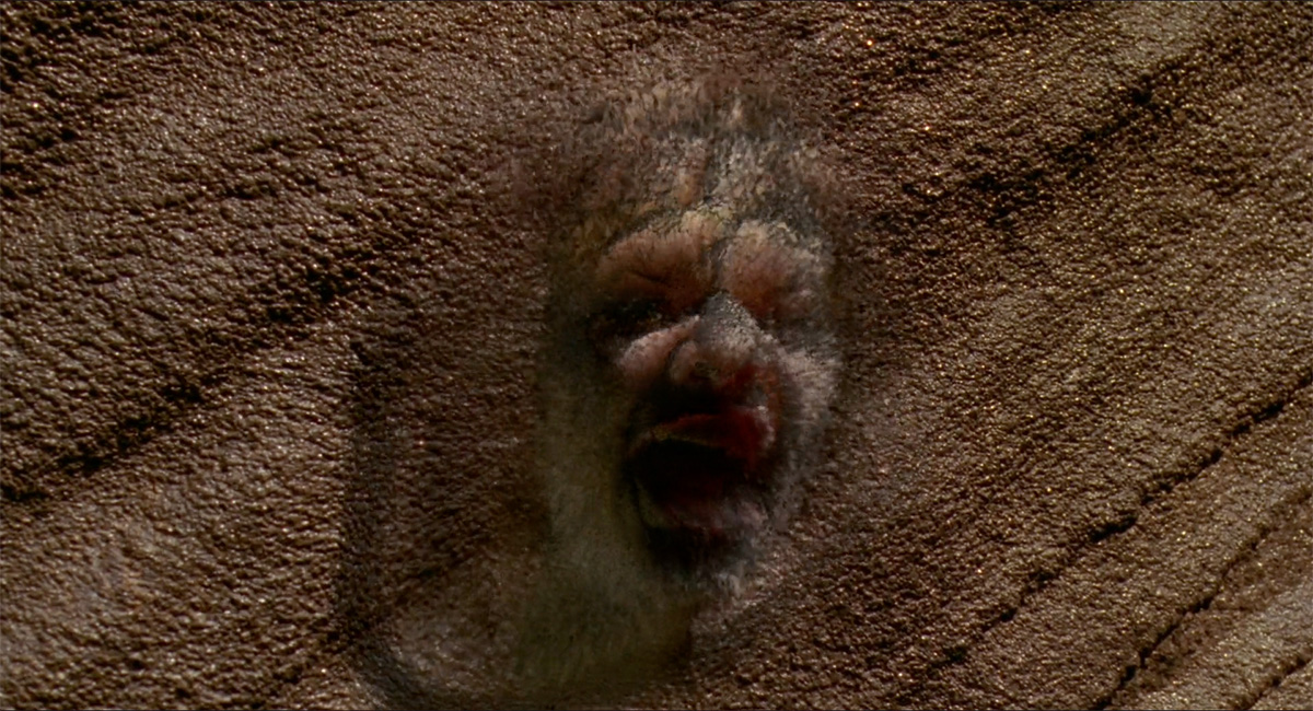 What I would do was take one frame, and I would basically do everything to that one frame, until I got an image that looked really good. Then I’d reverse engineer it across the series of images to figure out what I needed to do. And then Kevin Bjorke, who I worked with really closely on the face coming through the rock wall, he was doing the particle system. I would create this displaced image of a face coming through this rock wall surface they had photographed, and then I would give Kevin that element, and he would generate particles off of that. Quite sophisticated stuff, but no-one was doing that in 1992, with particle systems. It was really incredibly groundbreaking. He would pass that back to me, and I would incorporate that into my composited image.